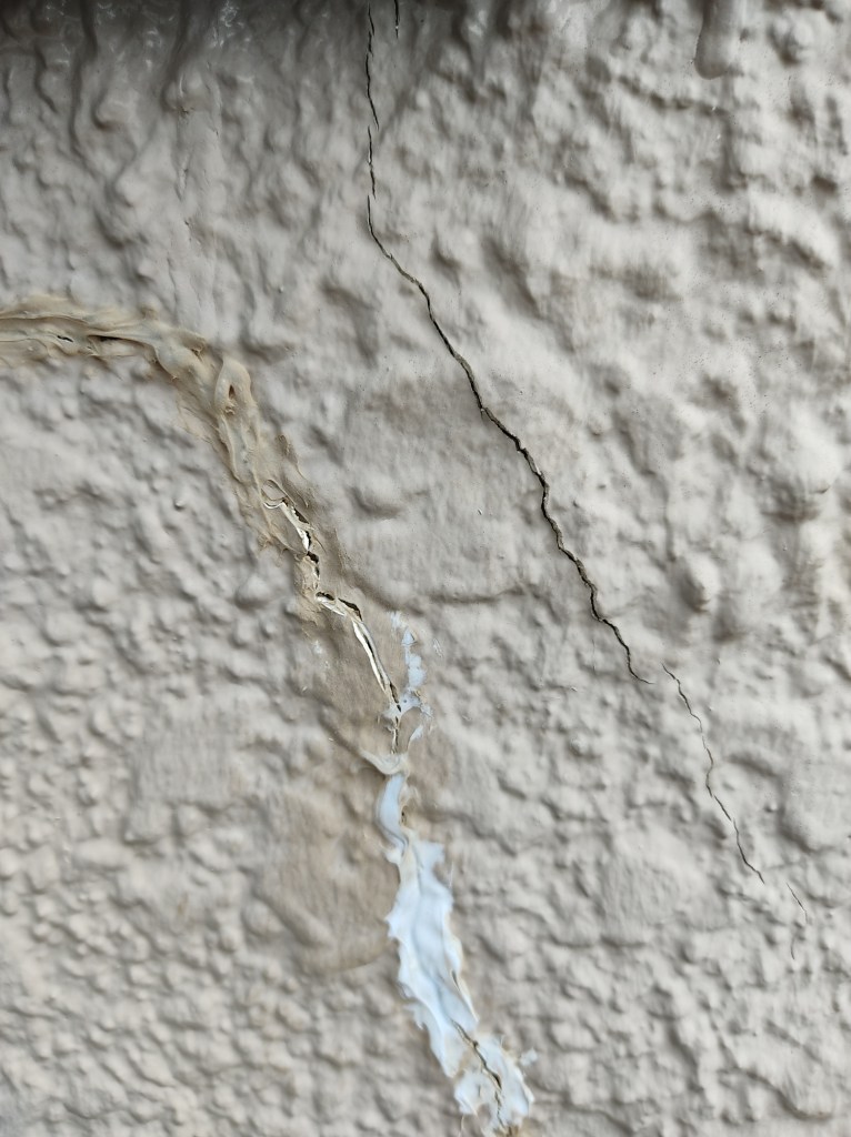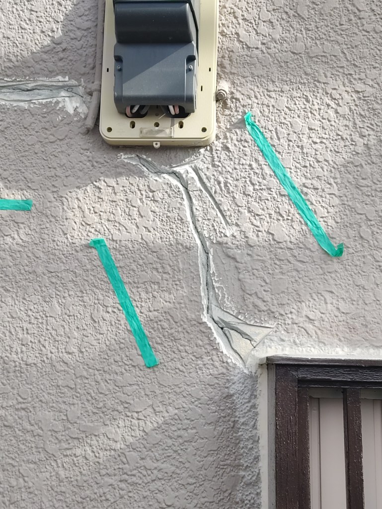 外壁のクラック(ヒビ割れ)と塗膜の間に雨水が入り込み既存塗膜の浮きがでてしまったものと推測されます。